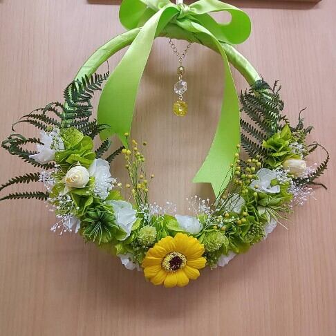送料込!幸運りぼんフラワーリース(グリーン系)