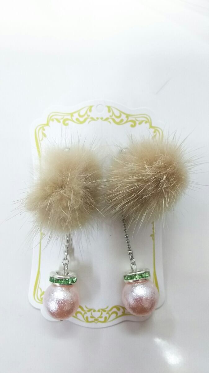 小ぶりのミンクファーとコットンパールをチェーンでぶら下げて作成してみました。